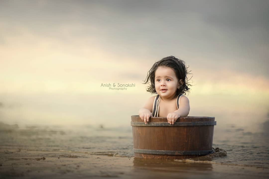 A robust wooden tub with metal accents mimics the looks of charming vintage barrels.