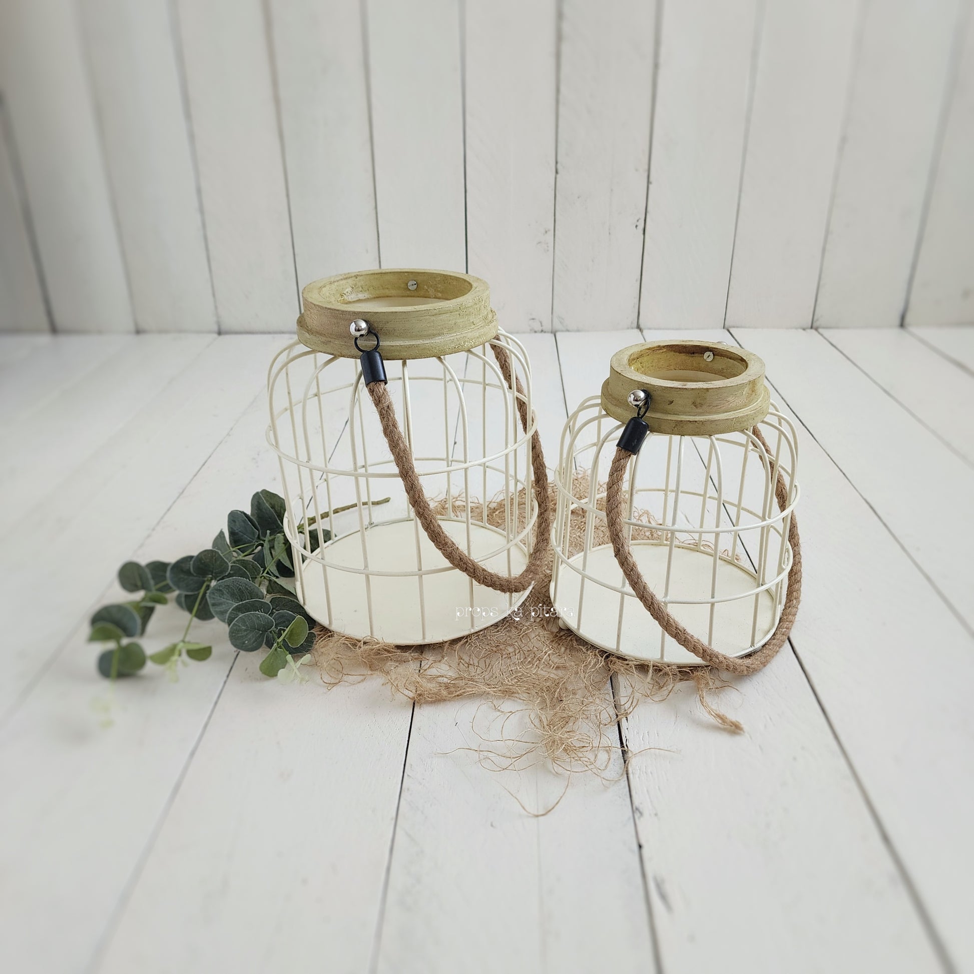 Handcrafted metal lanterns with rope detail. A perfect accessory for a variety of setups.