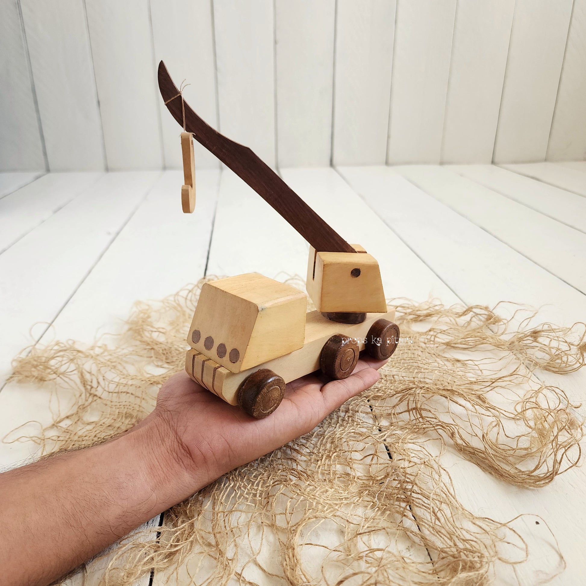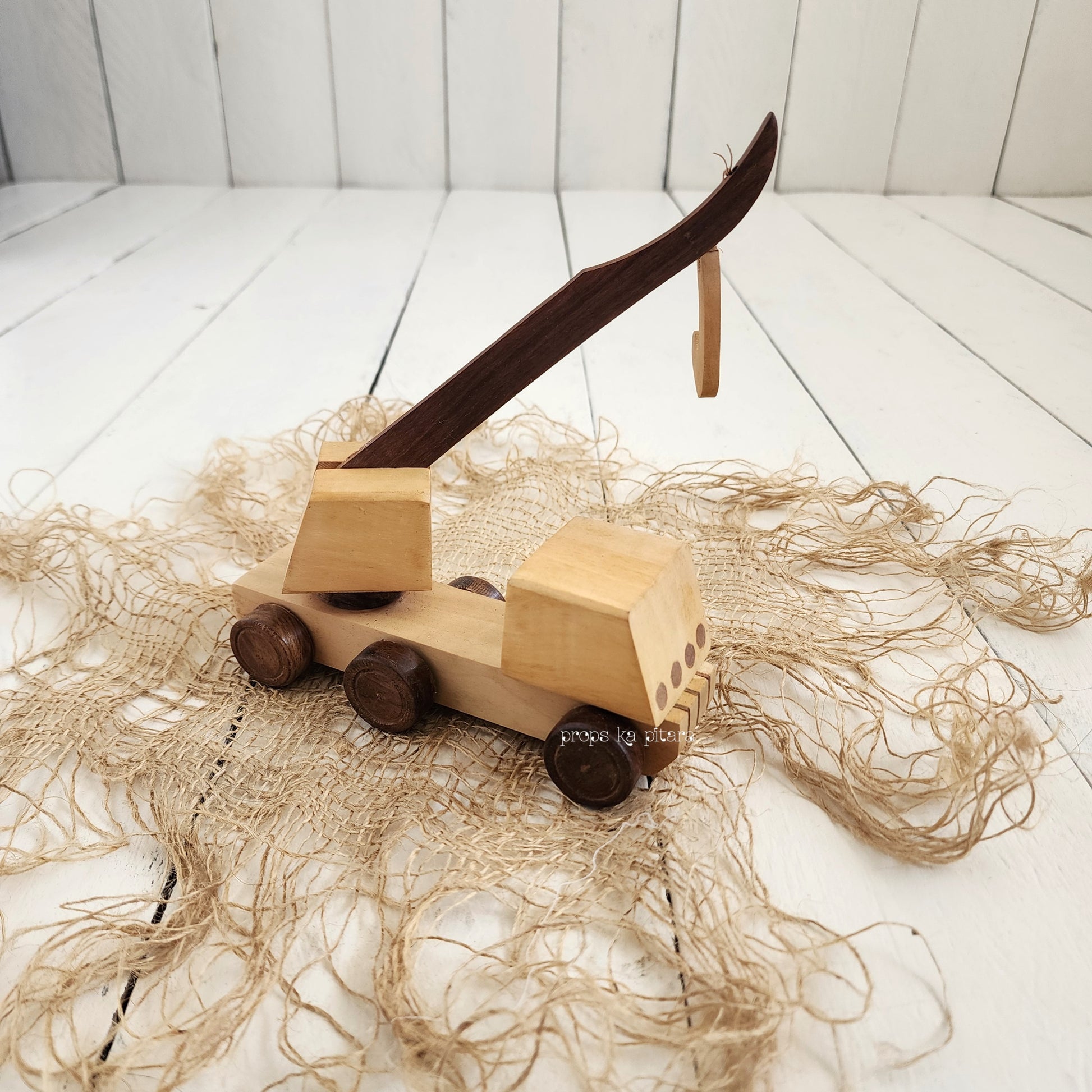 A beautifully handcrafted wooden Crane Truck that is ideal for a variety of setups.