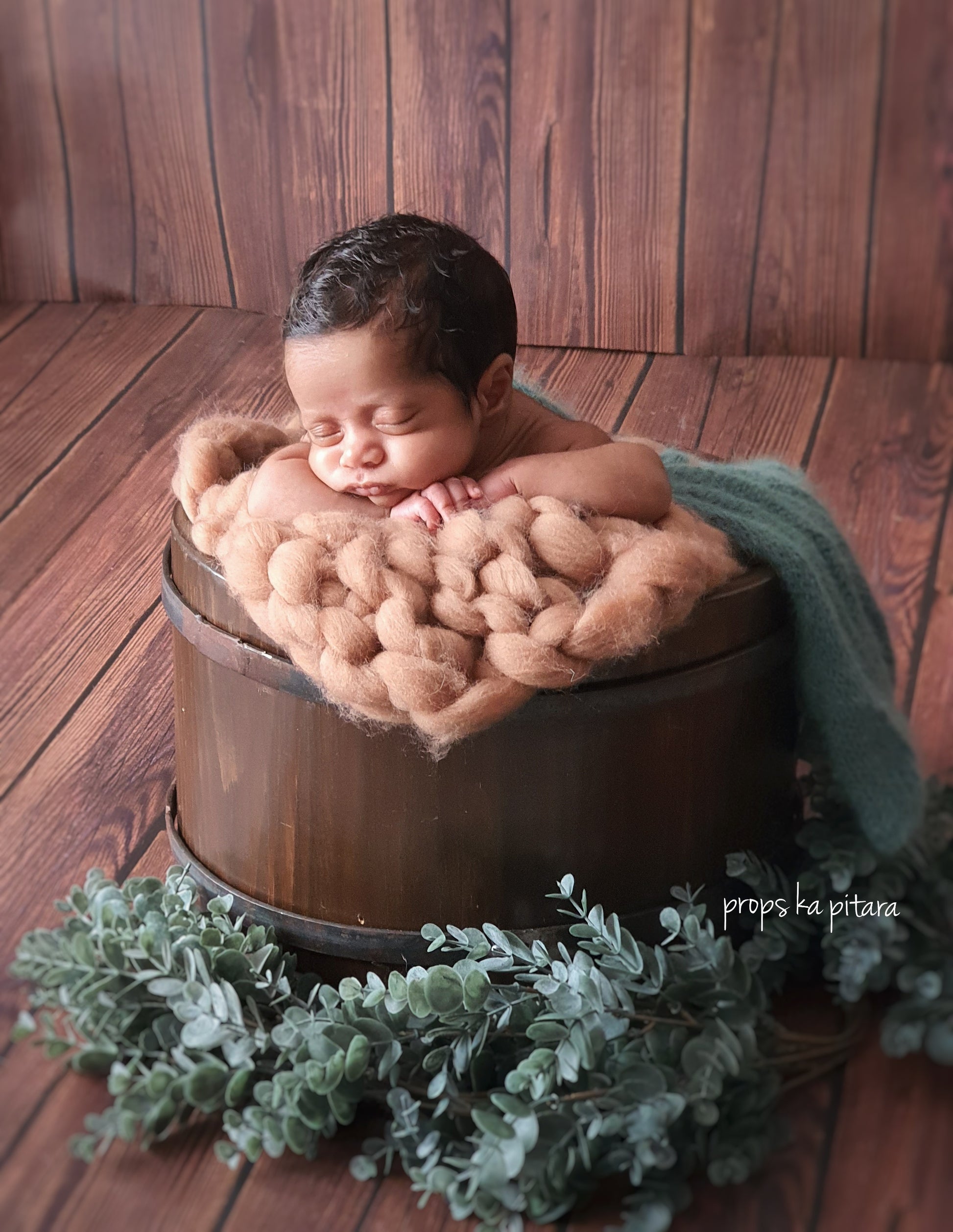 A robust wooden tub with metal accents mimics the looks of charming vintage barrels.