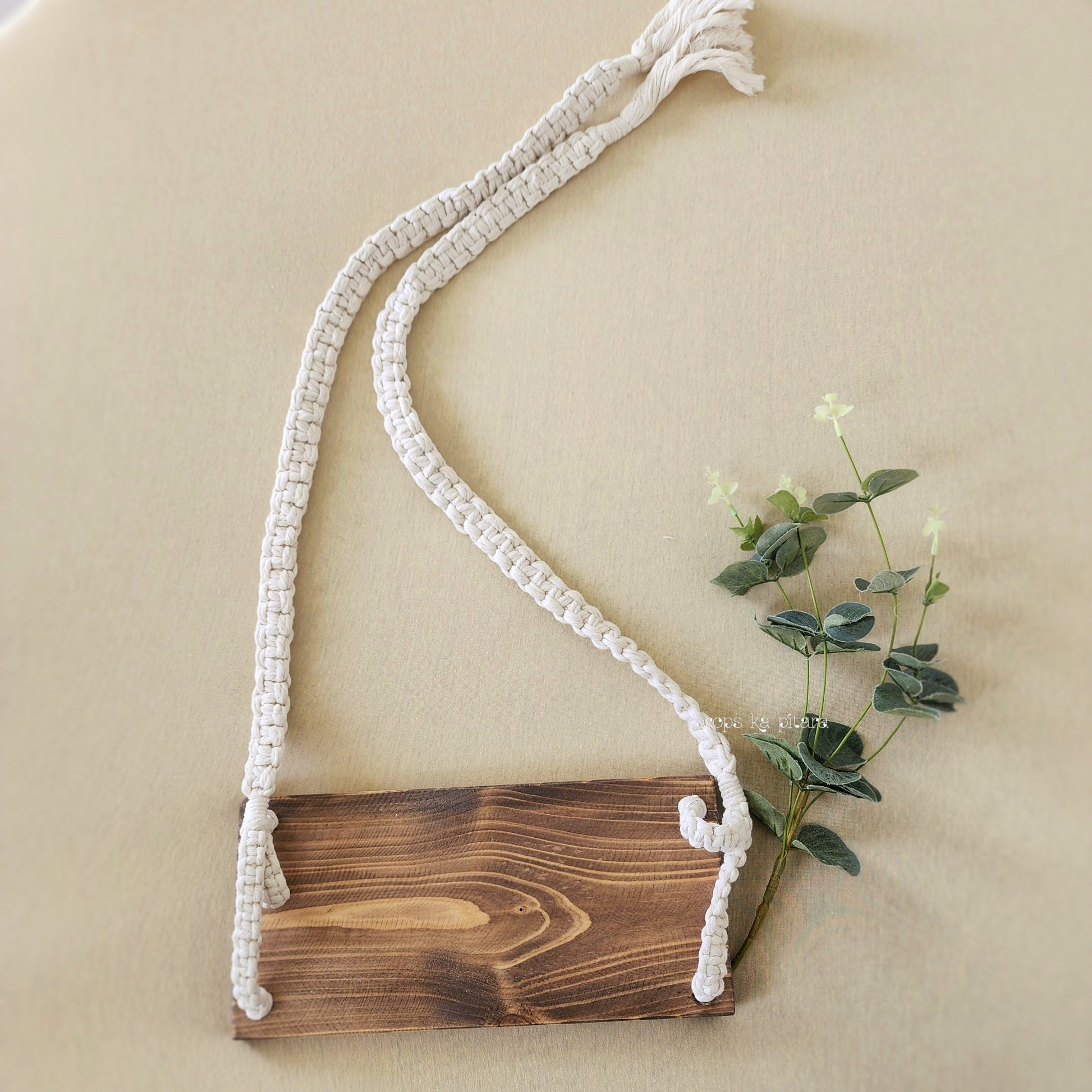 Wooden swing with handwoven rope details.