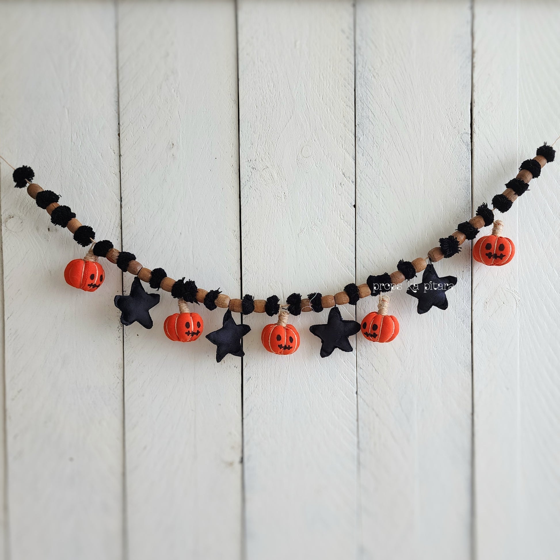 This banner is hand-made with cute mini pumpkins, plush stars and wooden beads.