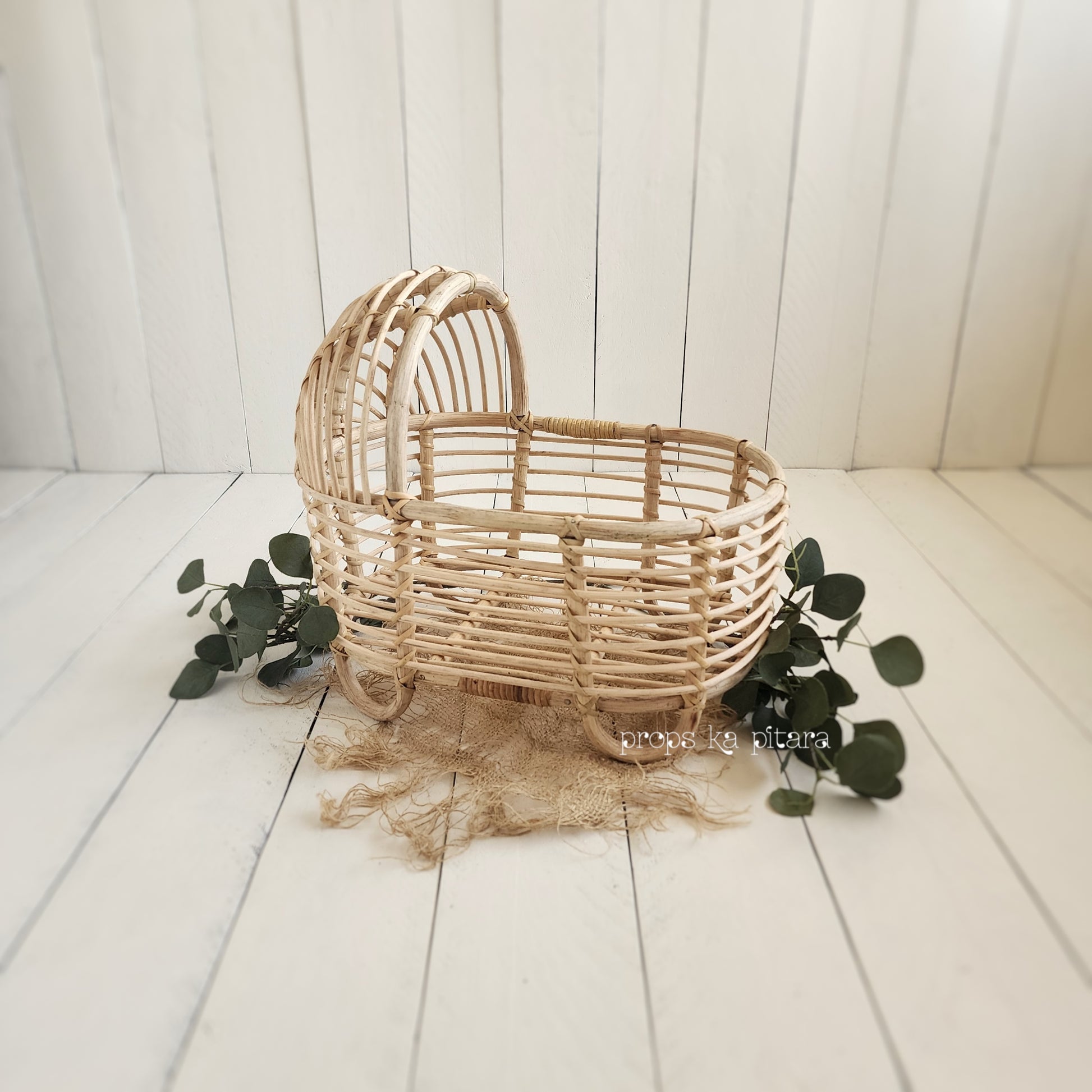 Lovely handcrafted wicker pram basket., made from natural materials, giving it a rustic organic look.